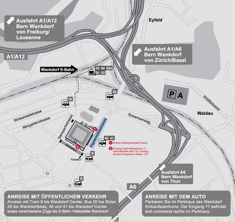 Durch den Eingang Papiermühlestrasse 71 treffen Sie ins Stadion ein. Der Eingang 71 befindet sich links vom Restaurant Eleven.